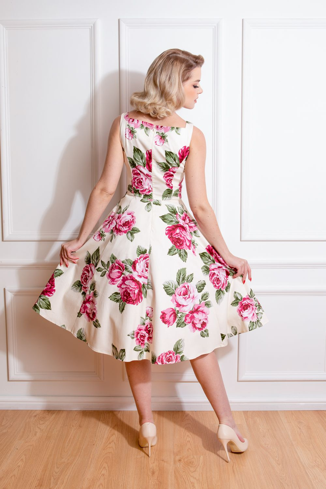 Tämä kellomekko on valmistettu pehmeästä ja joustavasta puuvillakankaasta, malli on paitsi kaunis, että myös erittäin mukava käyttää. Mekossa on upea, suurikokoinen vaaleanpunainen ruusukukkakuosi, jossa on kermanvärinen pohja ja rehevät vihreät lehdet. Sydänpääntie lisää tämän mallin suloisuutta, ja istuva yläosa ja leveä helma vintage-tyylistä tunnelmaa. Tätä mallia on helppo käyttää päivällä puistossa kävellessä tai illalliselle pukeutuneena. Lisää omat suosikkiasusteesi tai käytä sitä sellaisenaan.