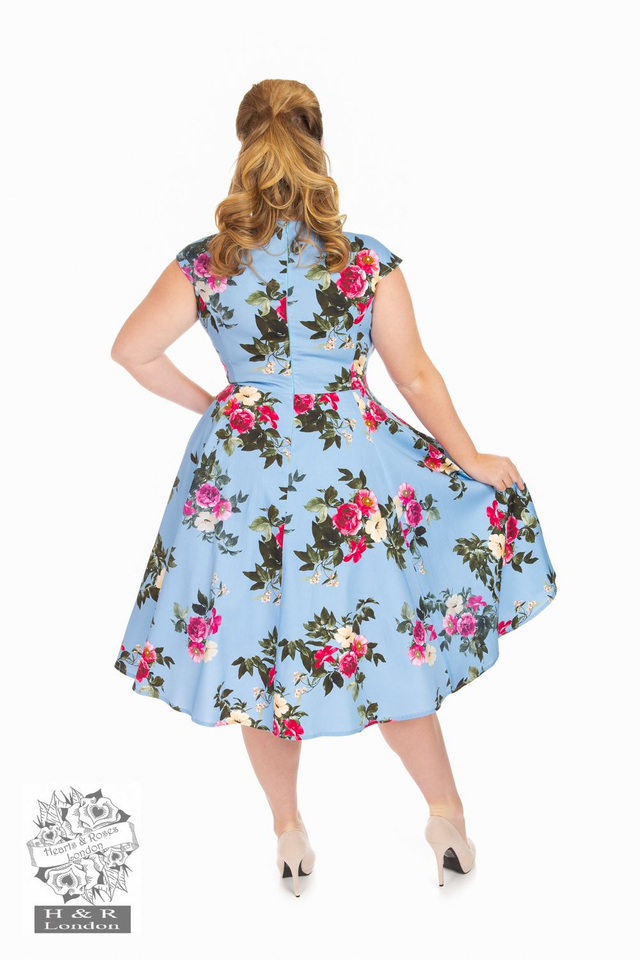 Kaunis sinipohjainen kukkamekko antaa sinulle naisellisen olon. Istuva yläosa ja leveä kellohame luovat yhdessä perinteisen 1950-luvun siluetin, jota rakastamme ja ihailemme. Piilotvetoketju takana tekee vaatteen pukemisesta helppoa. Kun olet saanut 50-luvun kampauksesi valmiiksi, olet valmis lähtemään mihin vaan, niin arkisiin kuin juhlaviin menoihin. Yhdistä balettitossujen tai korkokenkien kanssa täydentääksesi asun!
