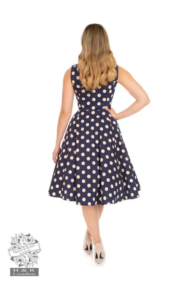 Perinteinen 1950-luvun inspiroima mekko, täynnä retrocharmia. Sen syvänsininen pohja sopii täydellisesti yhteen kermanväristen pilkkujen kanssa. Tässä mallissa on klassinen Audrey-pääntie, istuva yläosa ja leveä kellohame. Yhdistä valitsemiisi ballerina- tai korkokenkiin ja rohkeaan huulipunaan muuttaaksesi sen arki- tai iltalookiksi.