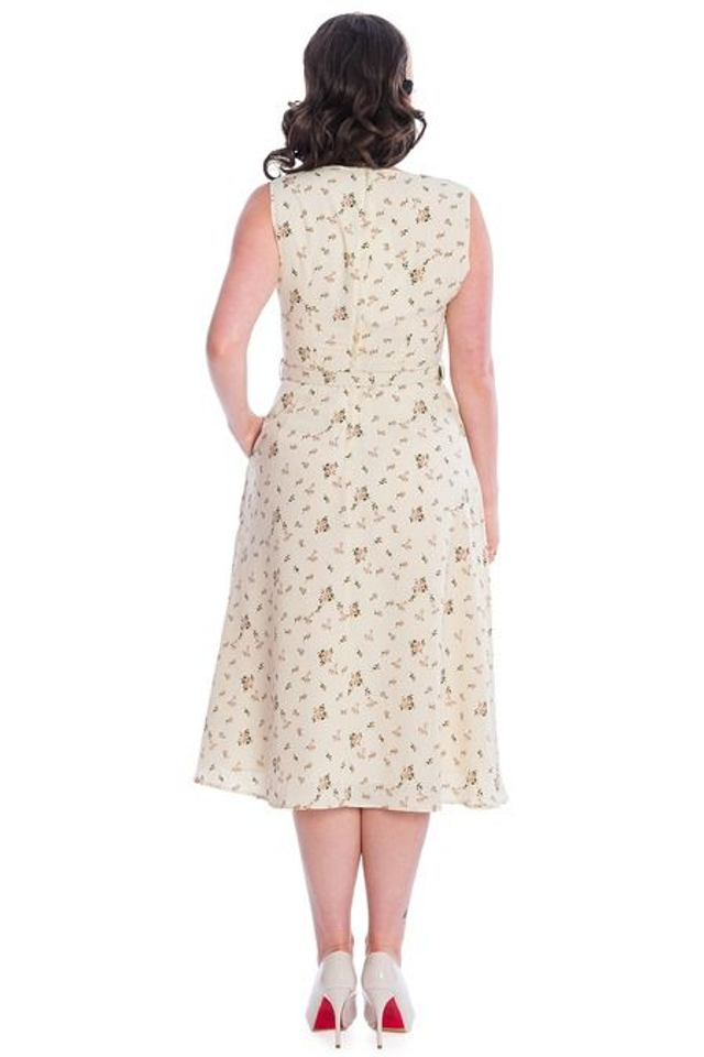 Elegantti luonnonvalkoinen mekko ruskean sävyisin kukkakuvioin. Keveä ja laskeutuva kangas. UK-mitoitus.