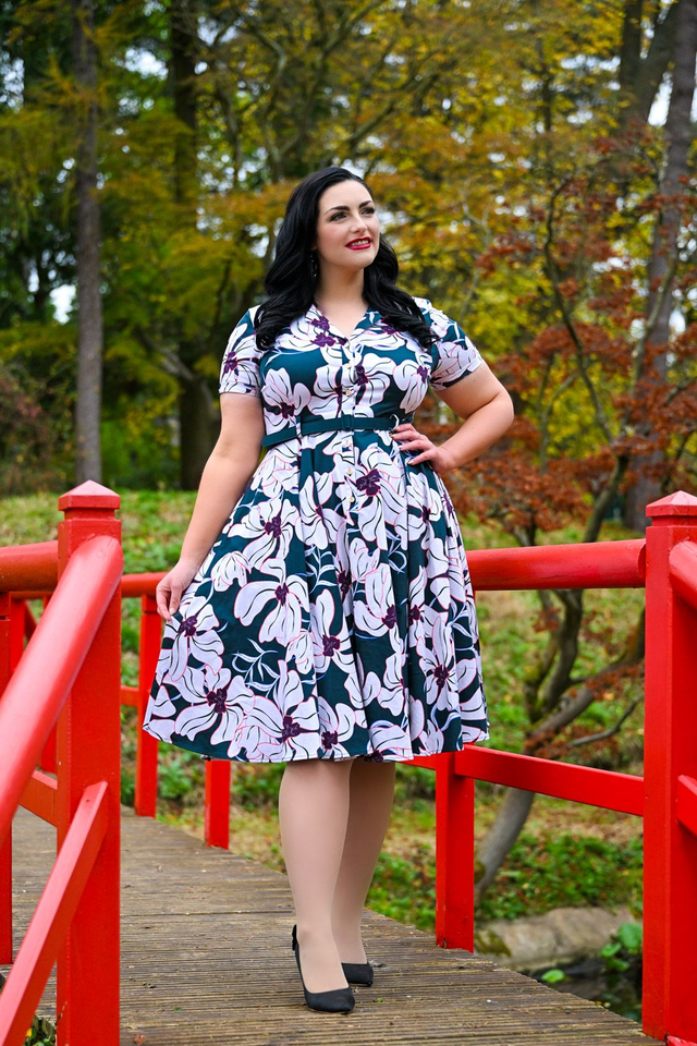 Quinn Floral Swing - kellomekko on viehättävä sekoitus klassista tyyliä ja raikkaita kukkakuosia. Pehmeästä puuvillasekoitteesta valmistetussa mekossa on tumman vihreä printti, jota koristavat kermanväriset kukat ja eloisat yksityiskohdat. Huolellisesti suunnitellussa mekossa on ajaton paitakaulus, lyhyet hihat ja edessä napit. Käytännöllisyys kohtaa eleganssin piilotetuissa sivusaumataskuissa ja irrotettavassa vyössä, jossa on solki, joka korostaa täydellisesti vyötäröä.